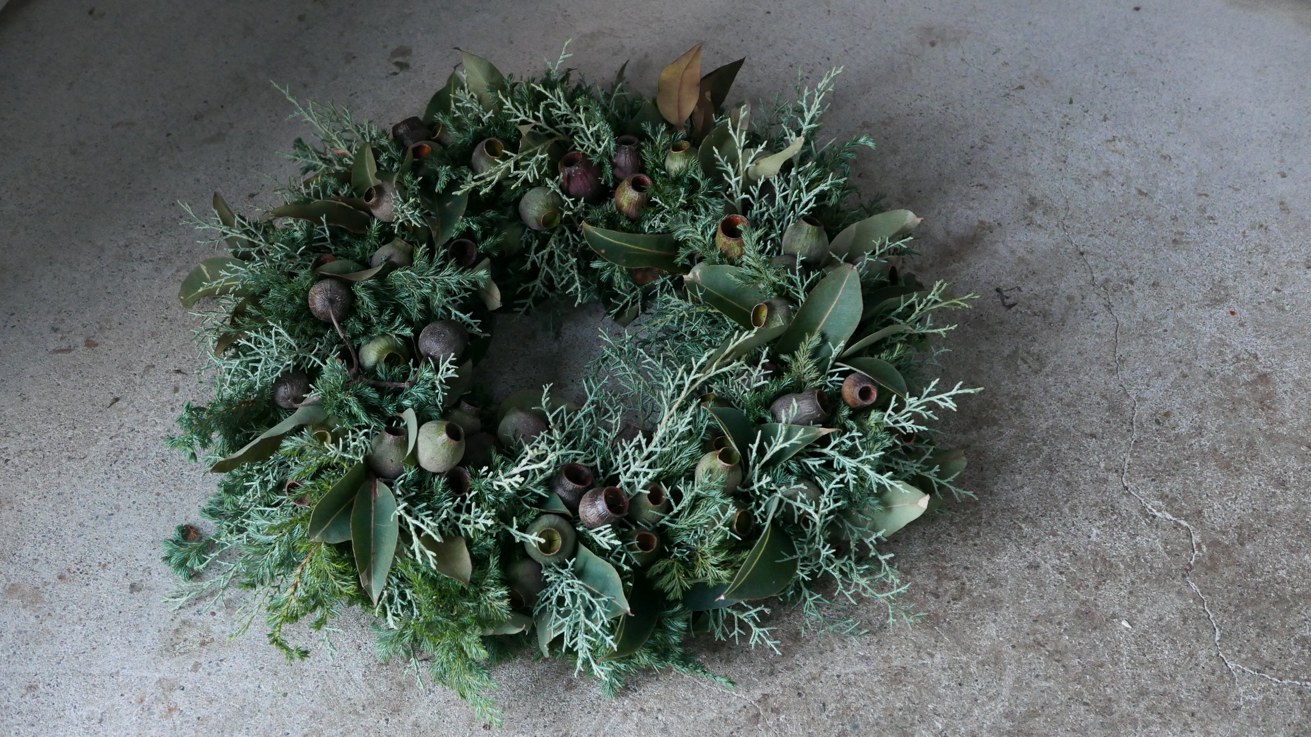 冬が近づき針葉樹が出回ってきました。今年もホリデーシーズンに向けてリースを仕立てます。複数の木や実を使って仕立てる定番です。クリスマスに関わらず冬の間お楽しみいただけるシンプルなものに仕上げています。森の木々を持ってきたような良い香りで冬を迎える支度をしましょう。