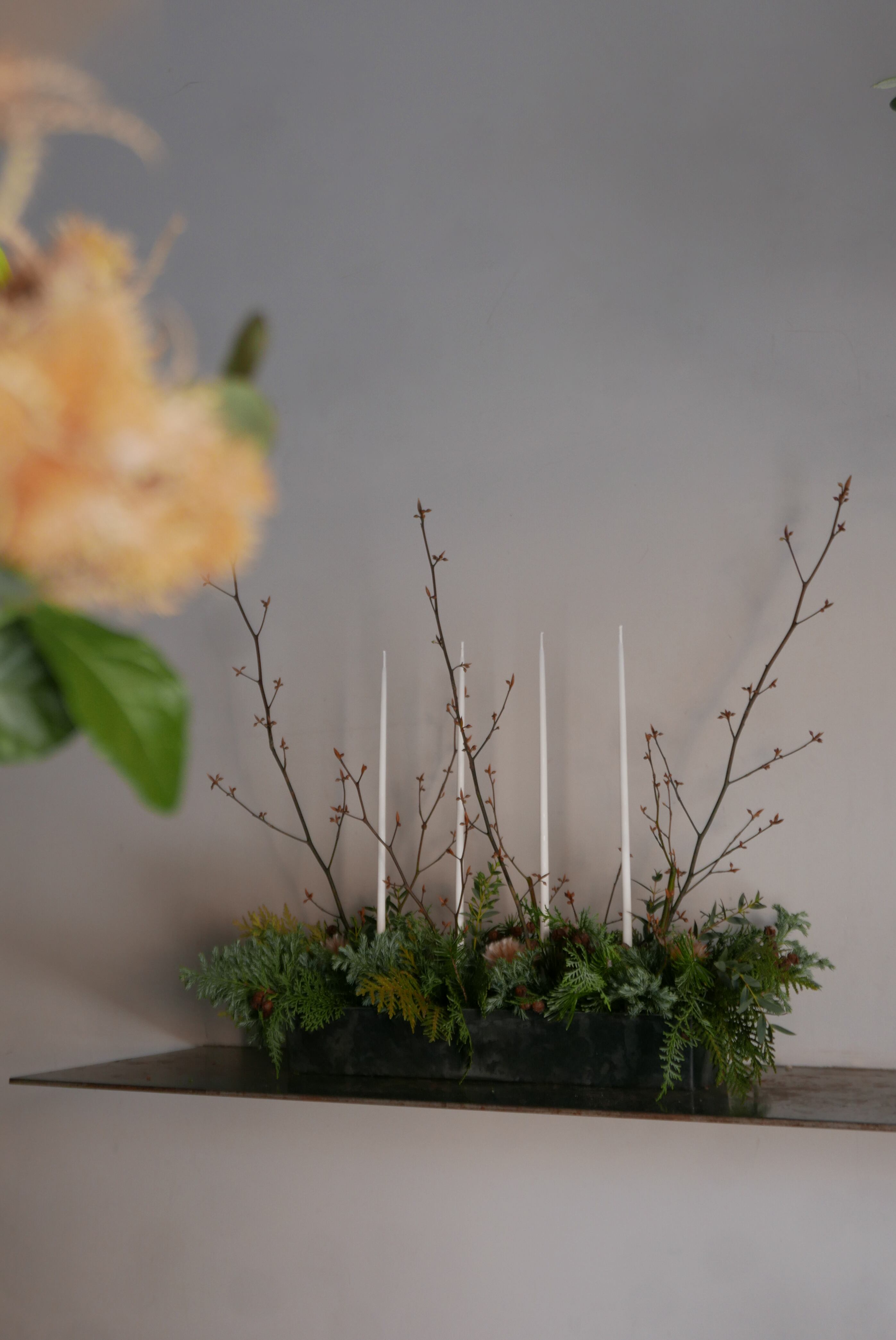 針葉樹とキャンドルをあしらったアレンジメント。クリスマスの日の飾りとしてテーブルや玄関に。ギフトとしてもおすすめです。