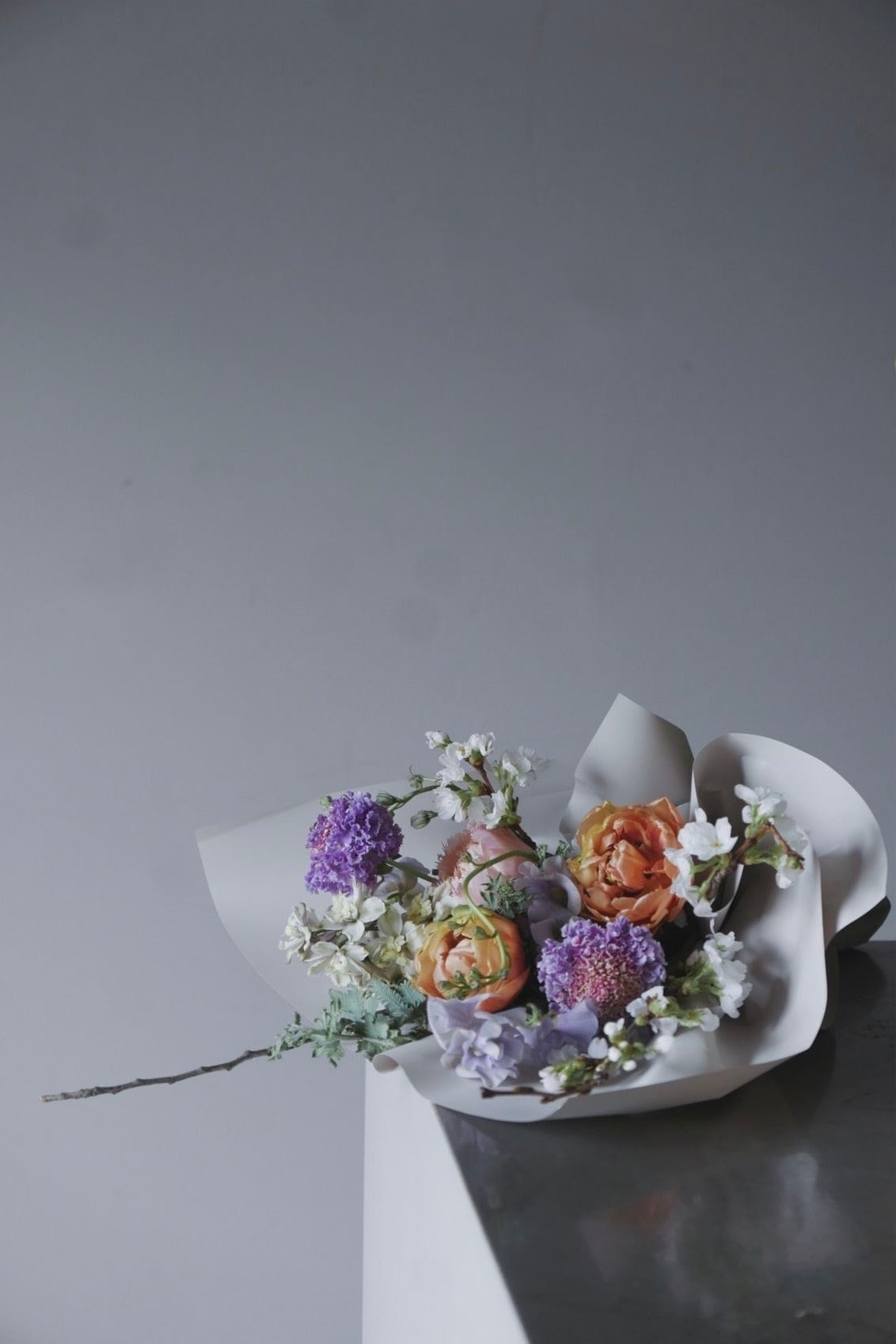 花束は切花を束ねたもの。花瓶に入れてお手入れをしたり、生け替えをしながらお楽しみいただけます。器がない分アレンジメントより花材がたくさん入ります。水保ちの都合上、北海道内(翌日着エリア)までのお届けです。